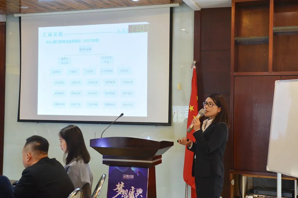 金強控股集團董事長劉金鈴、總裁翁斌及各中心、子公司、事業部高管等約20人參加會議。述職采取現場演講、PPT同步演示、董事長點評的方式進行。各高管分別從公司架構或中心/部門職責及成員情況、2020年度工作總結、2021年工作計劃三大方面進行述職。各高管在系統總結2020年度的工作成績,展示工作亮點的同時,分析工作中存在的問題及不足,并對2021年各項工作開展謀篇布局,定目標、定路徑、定措施。
