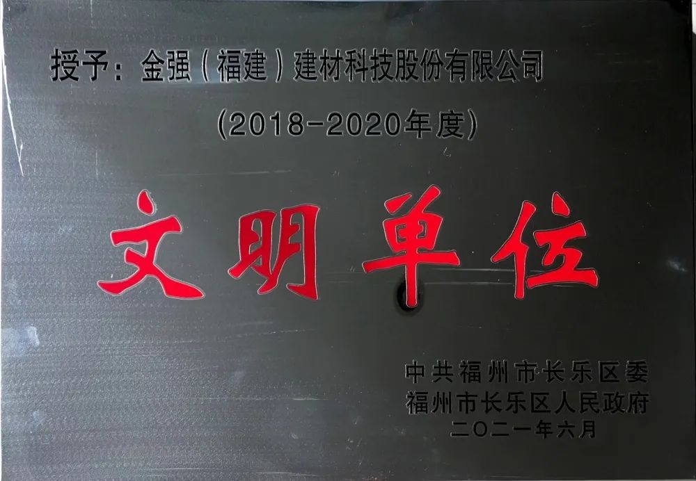 近日,金強建材科技正式獲得由中共長樂區委福州市長樂區人民政府授予的長樂區2018-2020年度文明單位牌匾。