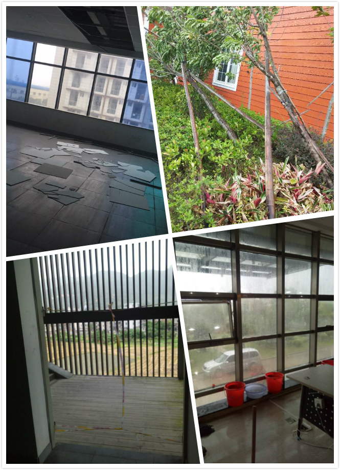 7月11日上午,超強臺風來襲,抗臺風小組嚴守一線,冷靜處理各自崗位面臨的玻璃破碎、樓宇漏水、物資脫落、樹木折斷等問題。