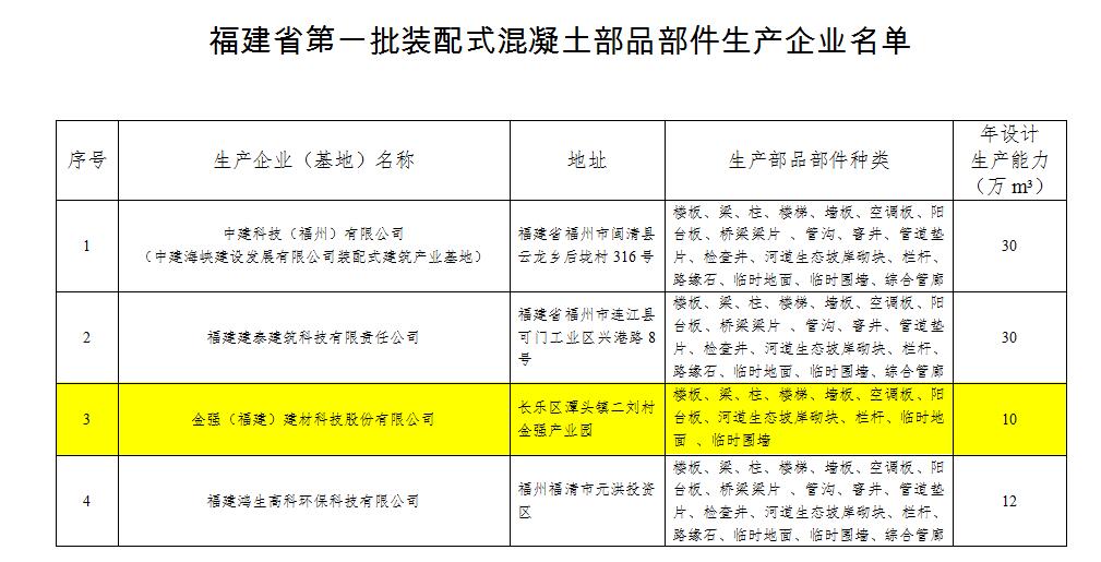 近期,福建省住房和城鄉建設廳公布福建省第一批裝配式混凝土部品部件生產企業名單,福建省共12家企業被列入其中,金強(福建)建材科技股份有限公司榜上有名。