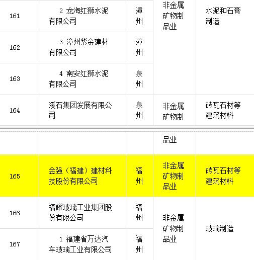 據悉,這次入選2018年福建省工業和信息化省級龍頭企業(含子公司)共有358家,大類行業涵蓋煤炭開采和洗選業、農副食品加工業、紡織業、計算機通信和其他電子設備制造業等35個大類行業。其中非金屬礦物制品業共有16家,細分行業磚瓦石材等建筑材料領域共2家,其中福州地區僅金強建材1家。