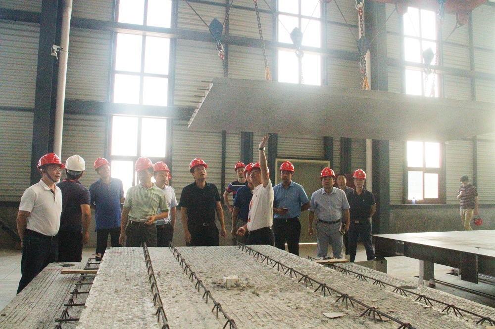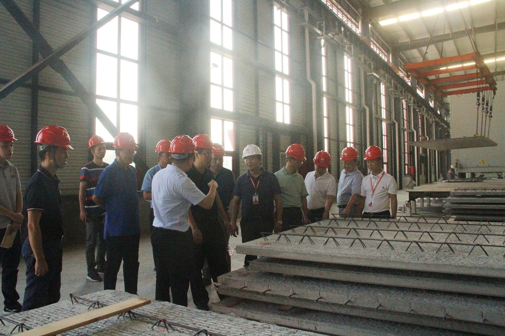 在車間內,由金強住工副總、金強裝配式混凝土系統生產線負責人呂勝利向領導一行,介紹了裝配式混凝土系統綠色節能環保的優勢,可實現節水70%,節材65%,減少現場施工粉塵80%,具有施工便捷,周期短的特點。