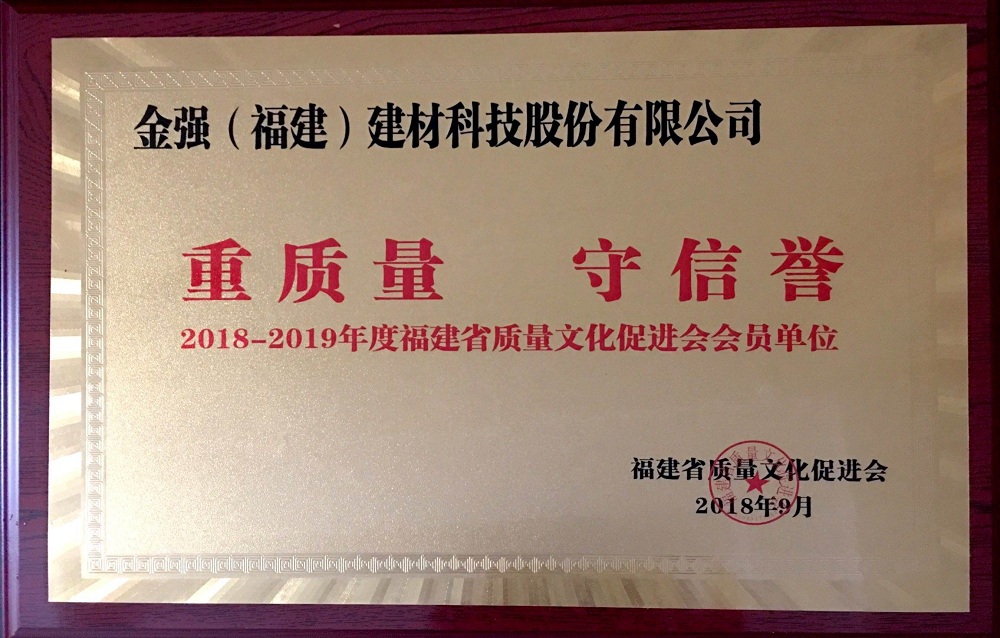 金強建材自創立以來,始終恪守誠信經營的理念,不斷規范和細化合同管理,近年來,還曾獲得過“2014-2015年度福州市守合同重信用企業”、“2018-2019年度福建省質量文化促進會‘重質量、守信譽’會員單位”等相關榮譽。