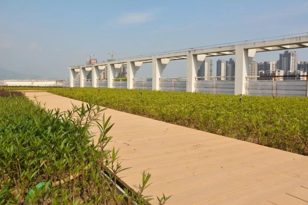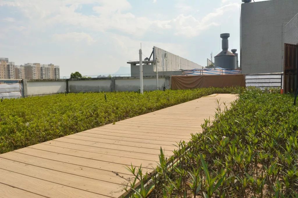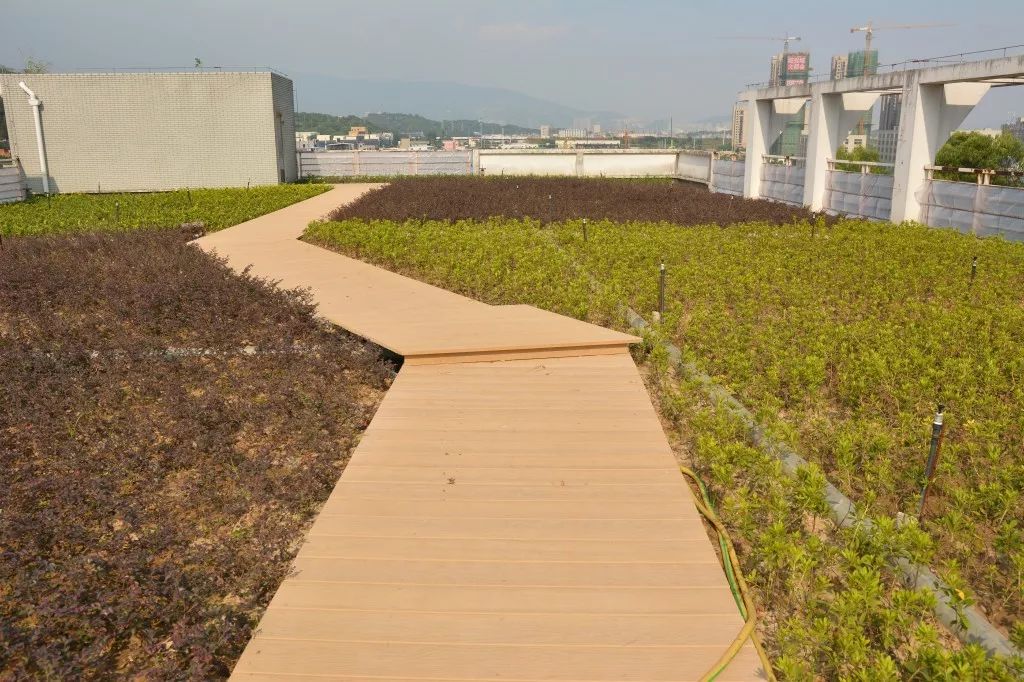 近期,福建騰龍鞋業有限公司就在其中一棟辦公樓樓頂設計打造了一個屋頂花園。該屋頂花園采用了具有木紋肌理的金強TKK板鋪設棧道,在蜿蜒的棧道兩旁是迎風生長的花草,整體設計雖較為簡單,但卻給這個樓頂增添許多自然氣息,更重要的是提高了辦公樓頂層的降溫隔熱效果。