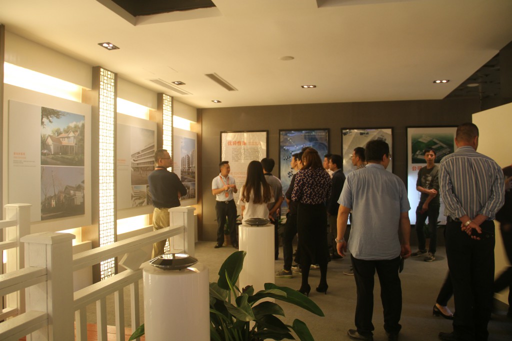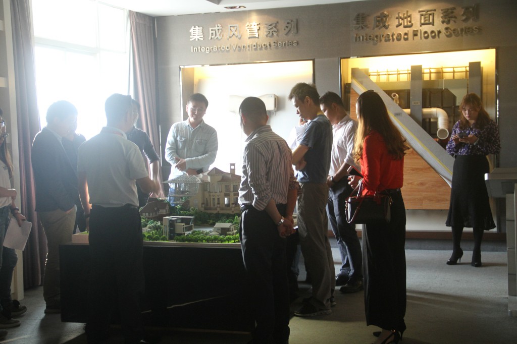 當(dāng)天,專家領(lǐng)導(dǎo)一行抵達(dá)金強(qiáng)后,首先在金強(qiáng)建材總經(jīng)理黎忠的帶領(lǐng)下參觀人文建筑館。參觀過程中,專家領(lǐng)導(dǎo)一行詳細(xì)詢問了金強(qiáng)裝配式一體化修系統(tǒng)的性能優(yōu)勢、施工特點(diǎn)等,在金強(qiáng)技術(shù)人員的詳細(xì)解說下,了解金強(qiáng)的綠色板材系統(tǒng)、裝配式圍護(hù)結(jié)構(gòu)系統(tǒng)、集成系統(tǒng)、裝配式部品部件等具有防火等級A1級不燃性,可縮短工期、節(jié)能環(huán)保等優(yōu)勢。