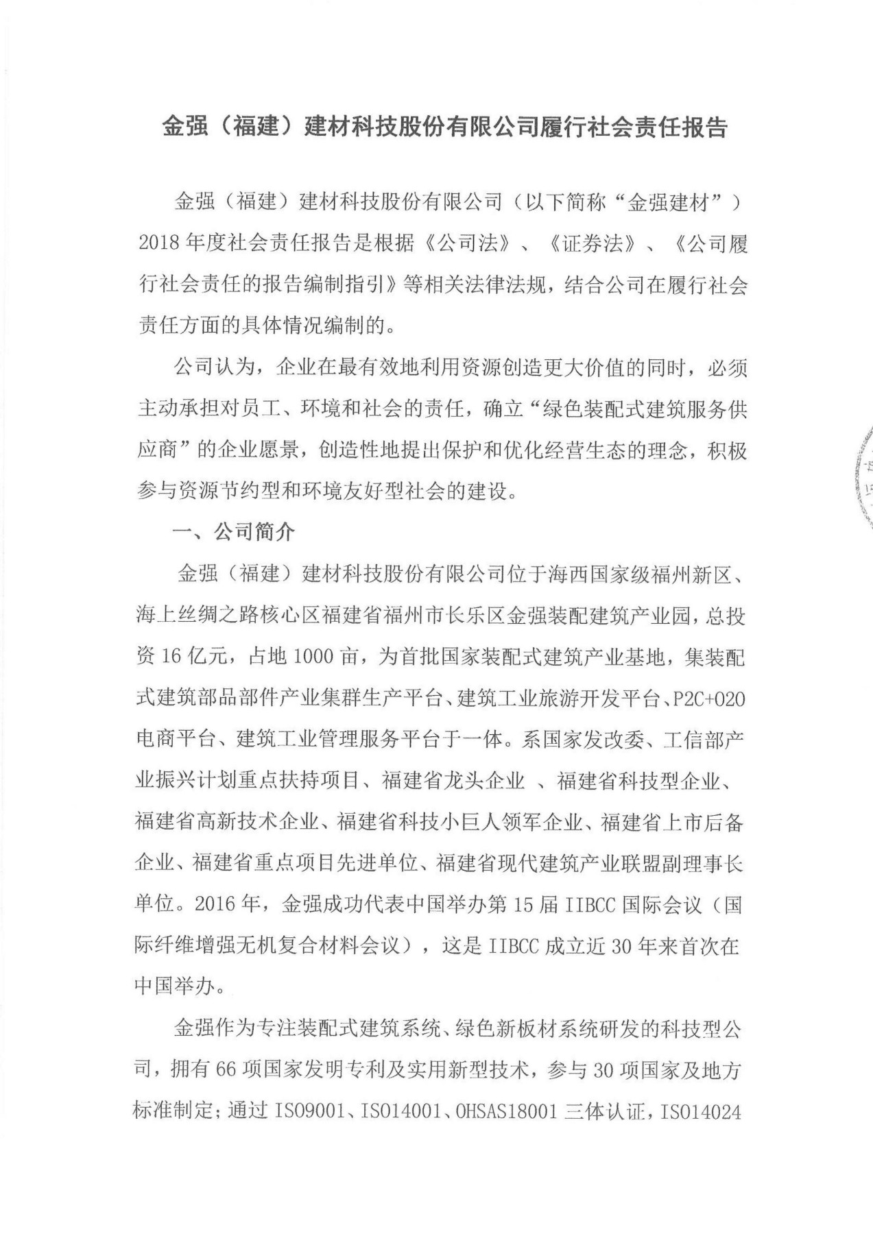 2018年度金強(qiáng)(福建)建材科技股份有限公司履行社會(huì)責(zé)任報(bào)告