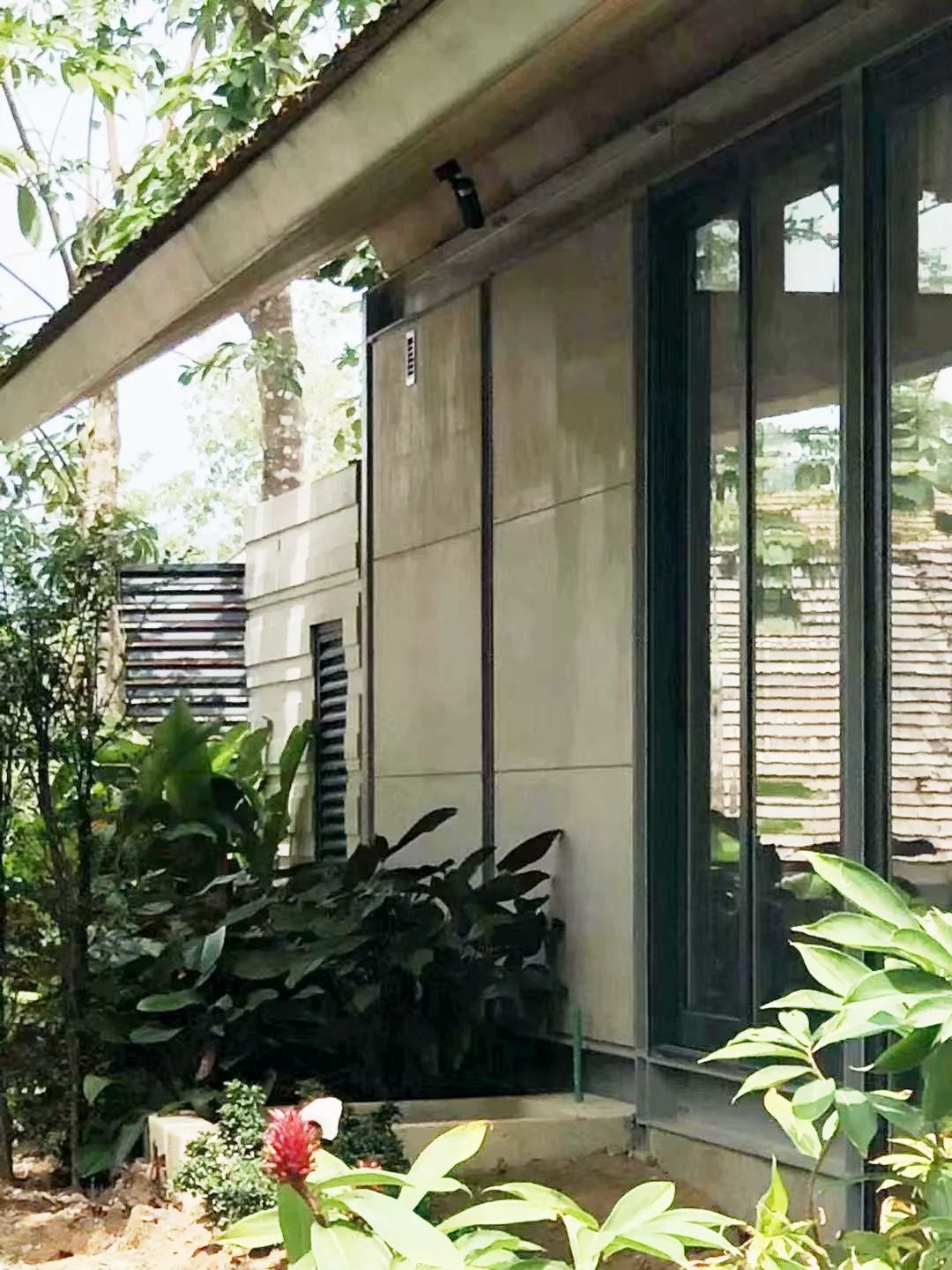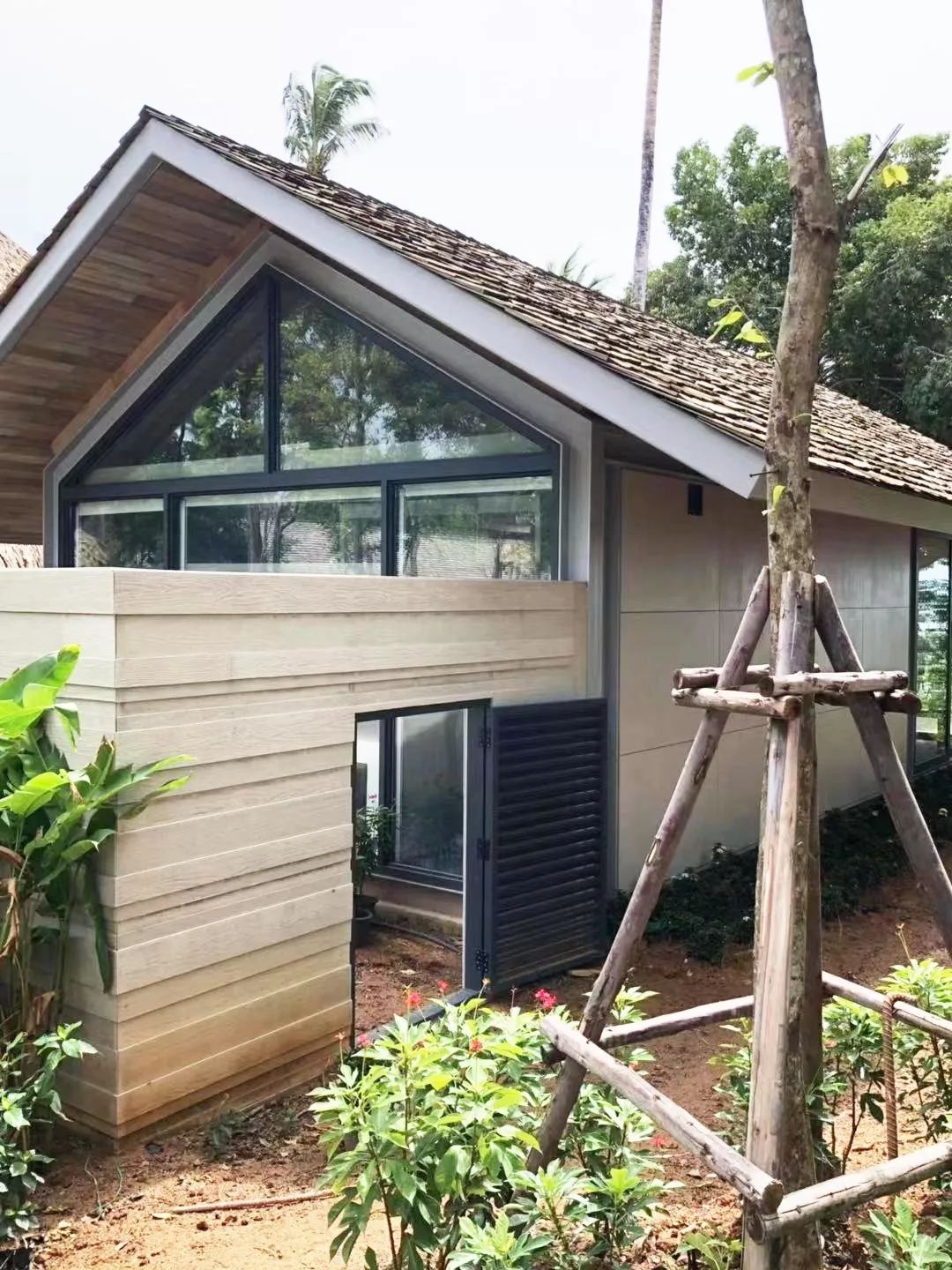 椰子島酒店地處海島,周圍環(huán)境濕度高,且位于熱帶,終年炎熱潮濕,多降雨。因此,在采用板材時(shí)需特別注重板材的防霉性、抗沖擊性,耐腐蝕性等。金強(qiáng)雙面木紋板(金強(qiáng)TKK板裝飾應(yīng)用于外墻)使用纖維硅酸鹽增強(qiáng)材質(zhì),具有優(yōu)越的防霉、防潮性能,可在高濕度的環(huán)境中使用,避免霉斑生長(zhǎng)。