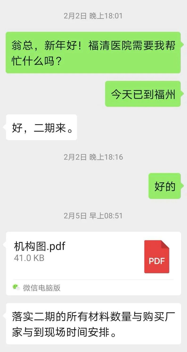 2月2日,福清市醫(yī)院新感染病區(qū)項(xiàng)目正在緊張推進(jìn),在家休假的李道桂聽說項(xiàng)目現(xiàn)場忙得不可開交,主動(dòng)聯(lián)系了集團(tuán)總裁翁斌,希望能幫上一點(diǎn)忙。“2月4日晚接到翁總電話,讓我去現(xiàn)場幫忙,第二天我就去了工地現(xiàn)場。”