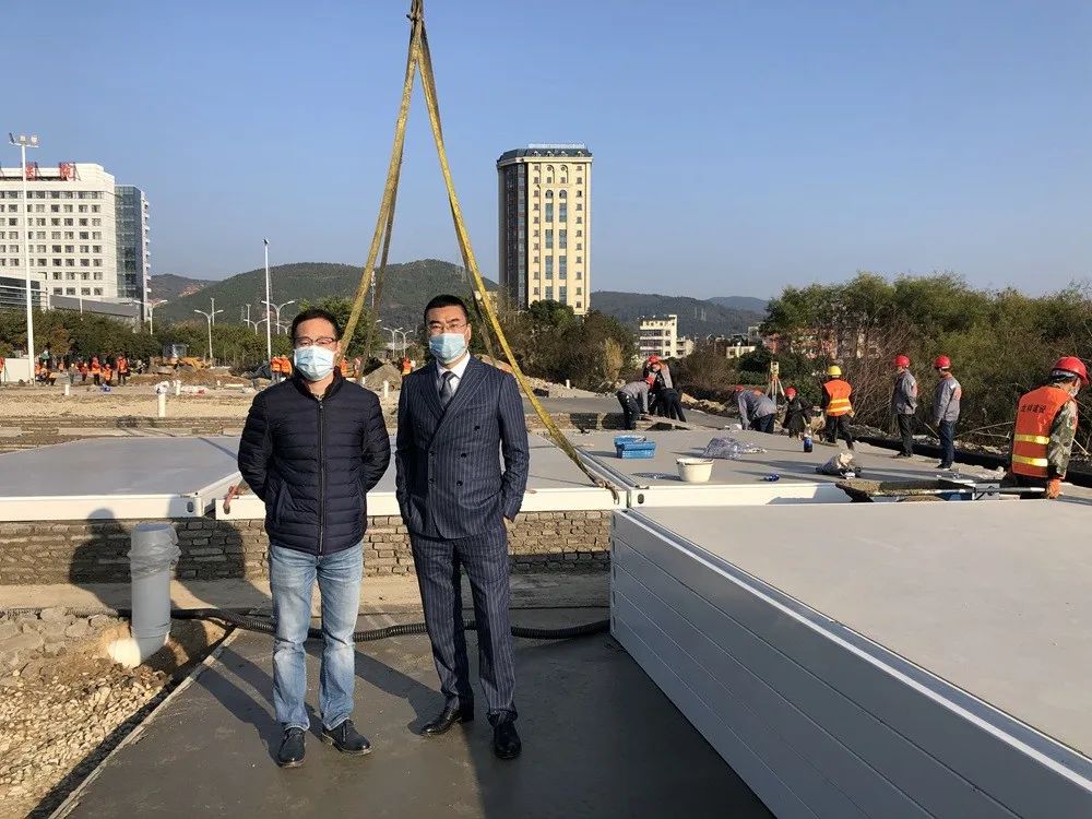 ▲金強(qiáng)控股集團(tuán)董事長劉金鈴,總裁翁斌赴福清市醫(yī)院新感染病區(qū)項(xiàng)目現(xiàn)場指導(dǎo)工作