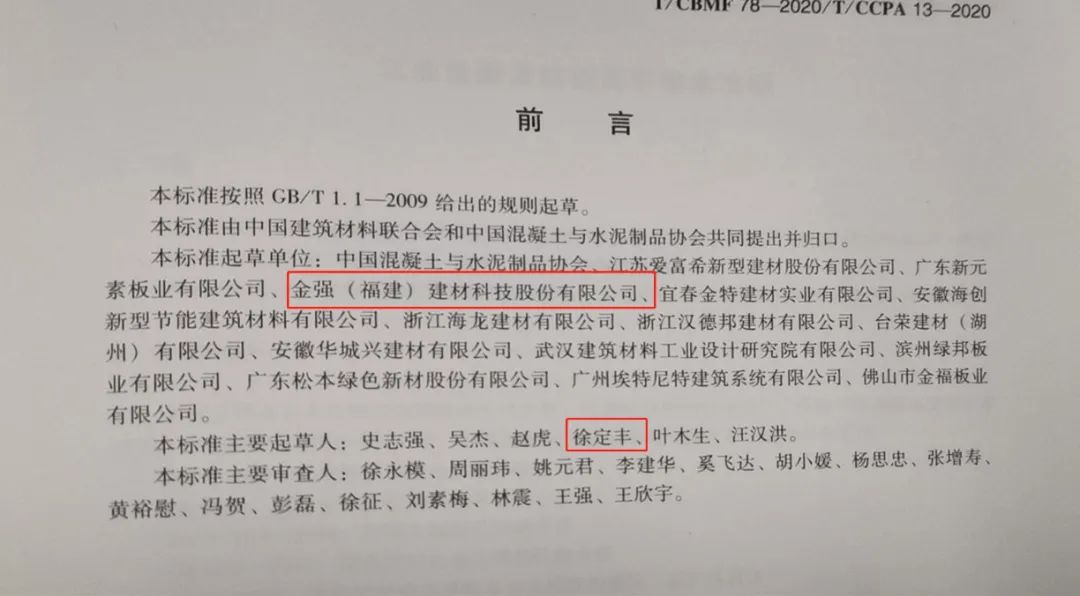 ▲金強建材為本標準的起草單位之一;金強建材副總經理徐定豐、金強控股集團技術委員會副主任曾文之、中恒建筑總工林志堅為主要起草人