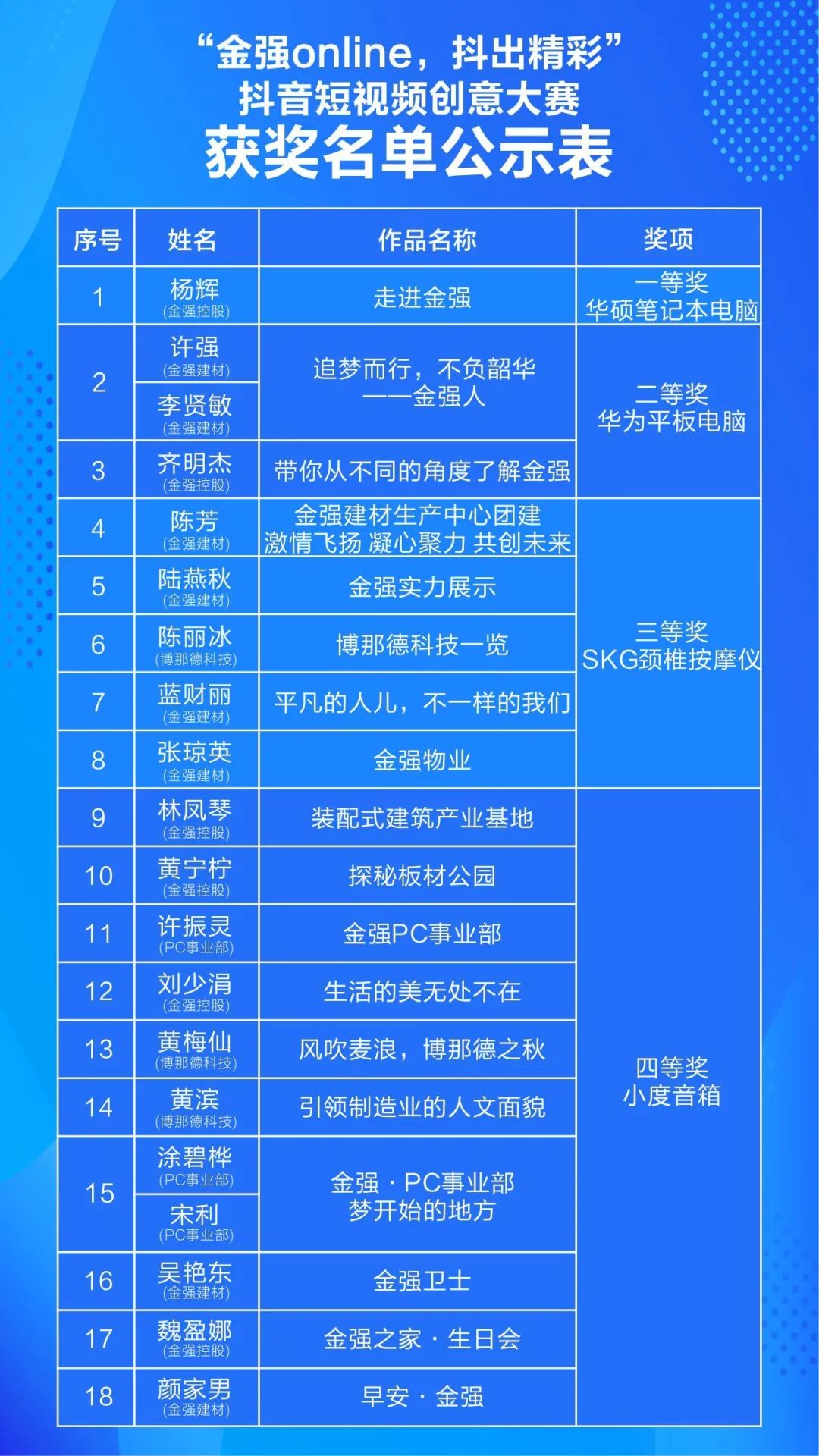 活動期間,在抖音平臺中,“金強online抖出精彩”話題累計收獲4465次播放,借助此次活動,所有的參賽人員用自己的成果和努力為金強控股集團在短視頻時代開疆拓土邁出了第一步。本次比賽經過一個半月時間的激烈角逐和評審團的專業評審之后,終于從眾多投稿稿件中將18個出彩的視頻篩選、呈現出來,以下為本次活動獲獎人員名單。