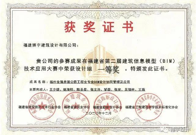 本次BIM大賽共設設計組、施工組、綜合組三個組別,充分展示了福建省建設領域在BIM技術應用發展的優秀成果和杰出貢獻。其中“福州金強房屋公園工程全專業BIM設計協同管理及應用”榮獲設計組“一等獎”。