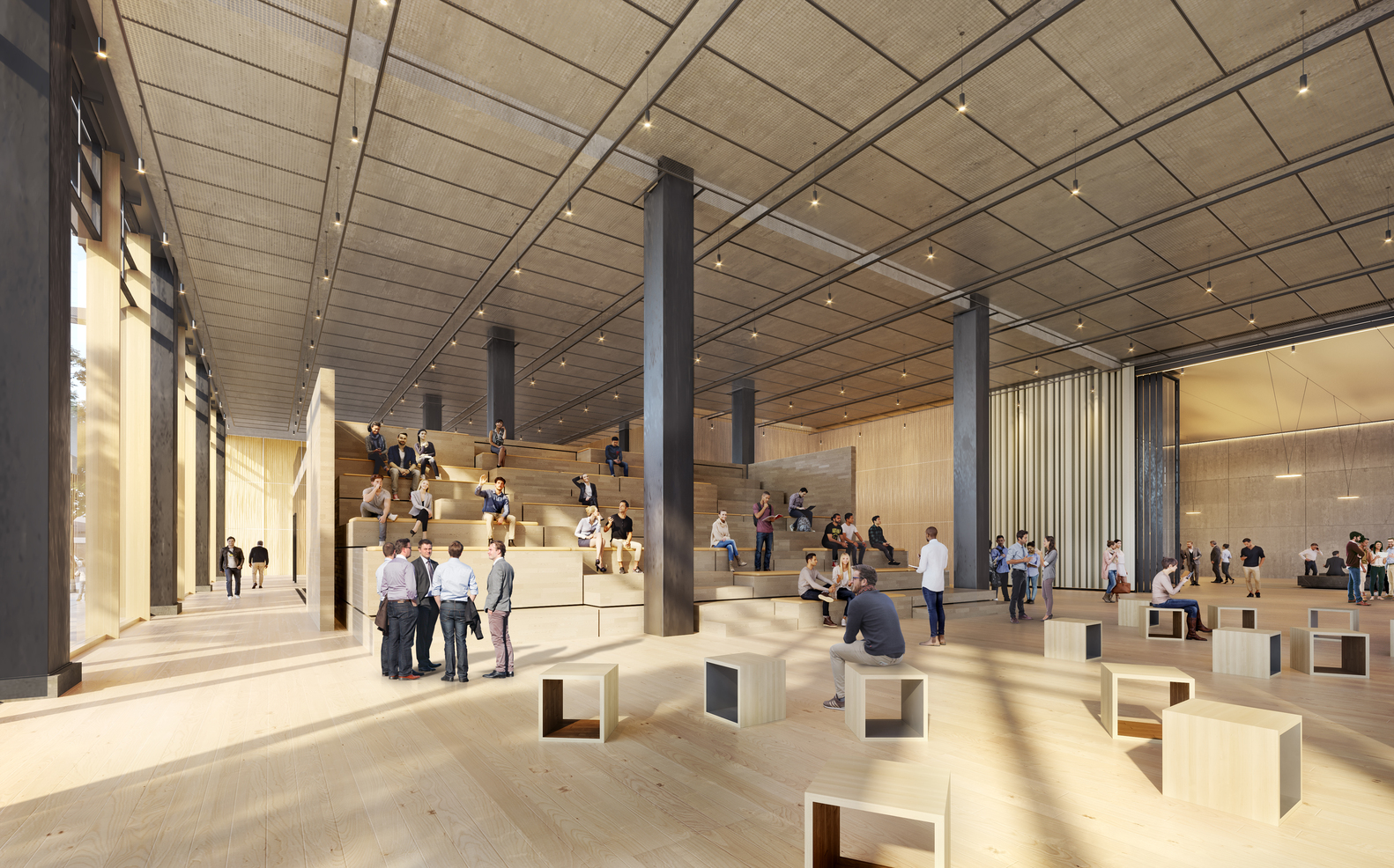 項目面積 67萬平方英尺(約6.2萬平方米), SOM 的方案特點是外露鋼筋和核心結構的通高落地窗 ,最大限度地利用自然光和開闊的空間。 設置在一個30英尺x30英尺(9 m x 9m)的網格上,從地板到天花板高度14英尺(4.2m),內部提供靈活的協同工作和活動空間,有一個戶外健身平臺、咖啡廳、酒吧、圖書館和200個停車位。