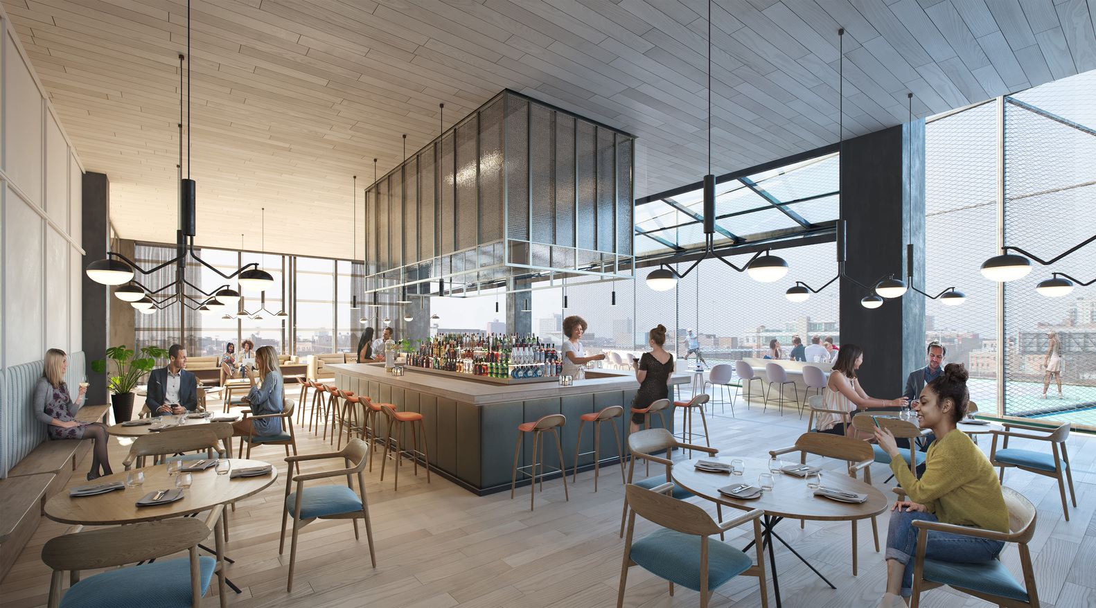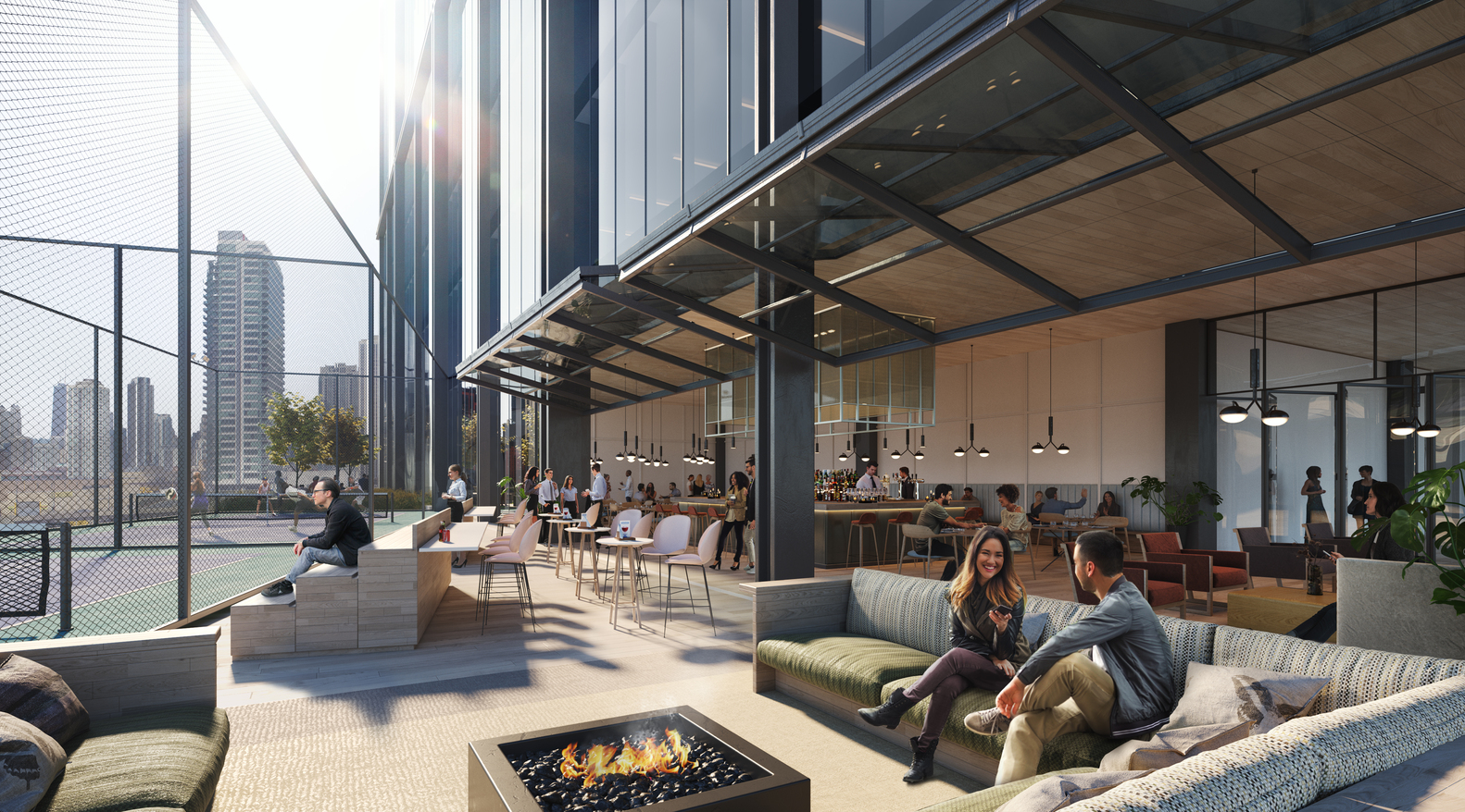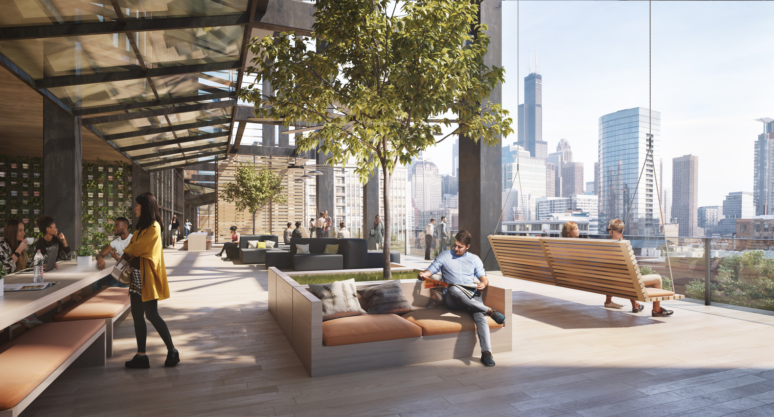 該方案的一個重要組成部分是位于五層樓的露天平臺,可以通過折疊的玻璃幕墻俯瞰芝加哥的西環。其他的戶外空間包括一個7700平方英尺(715平方米)的健身平臺,有槳式網球場和一個6000平方英尺(550平方米)的室內室外租戶休息室,擁有觀看在整個城市的開闊視野。一層將整合附近2.5萬平方英尺 (2300 平方米) 的零售空間。